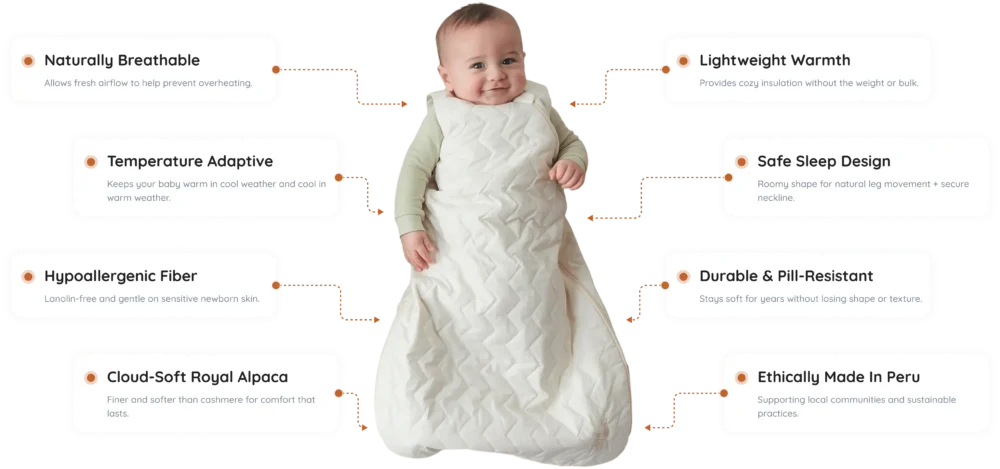Chillpaca™ is crafted from ethically sourced Royal Alpaca fiber — naturally soft, breathable, and gentle on sensitive skin. Designed to help babies sleep longer and more comfortably, it offers lightweight warmth without overheating and a feel unlike any other sleep sack.